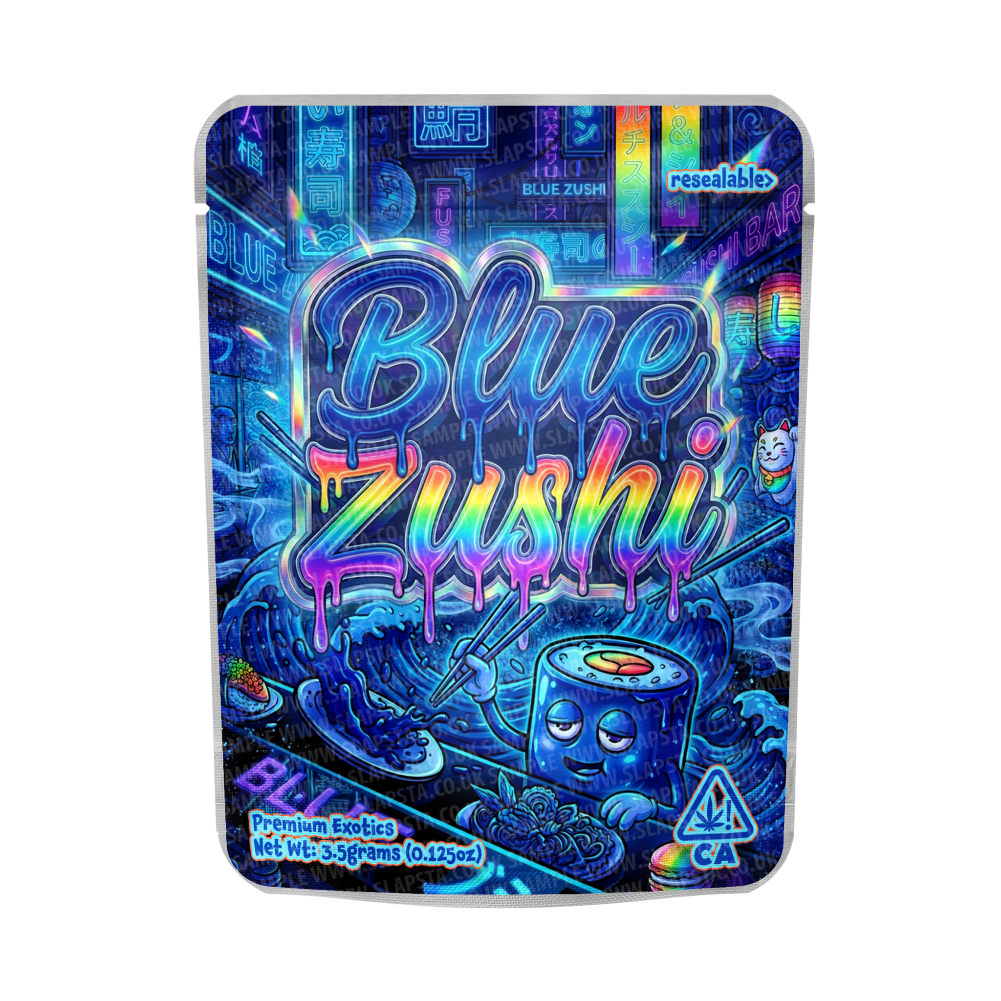 Premium resealable smell-proof mylar pouches featuring a Blue Zushi vinyl label professionally pre-applied, built for fast, retail-ready packaging with consistent quality.
