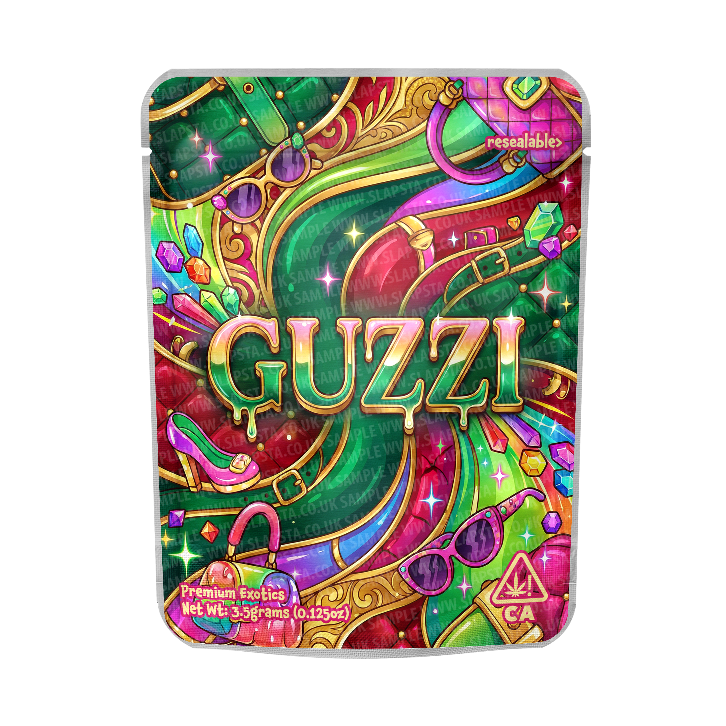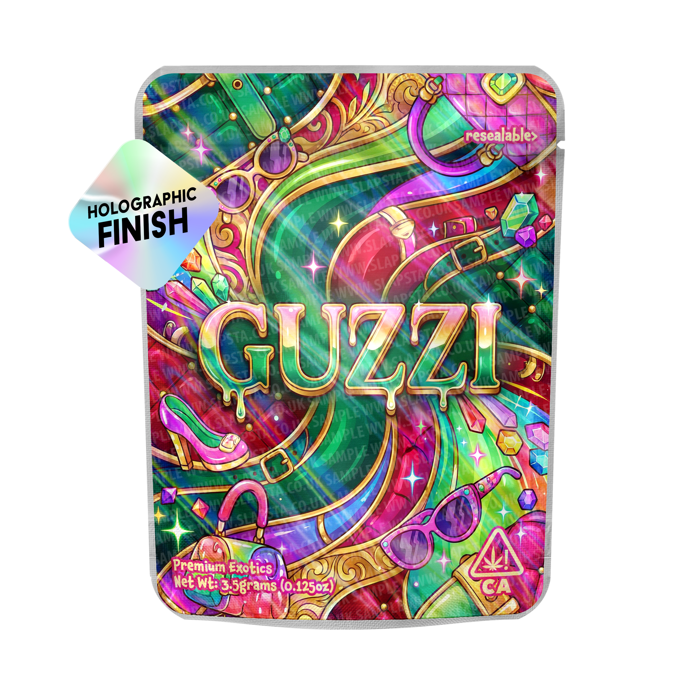 Resealable, smell-proof mylar pouches, with a 'Guzzi' mock designer vinyl sticker pre-applied, with a choice of various finish options.