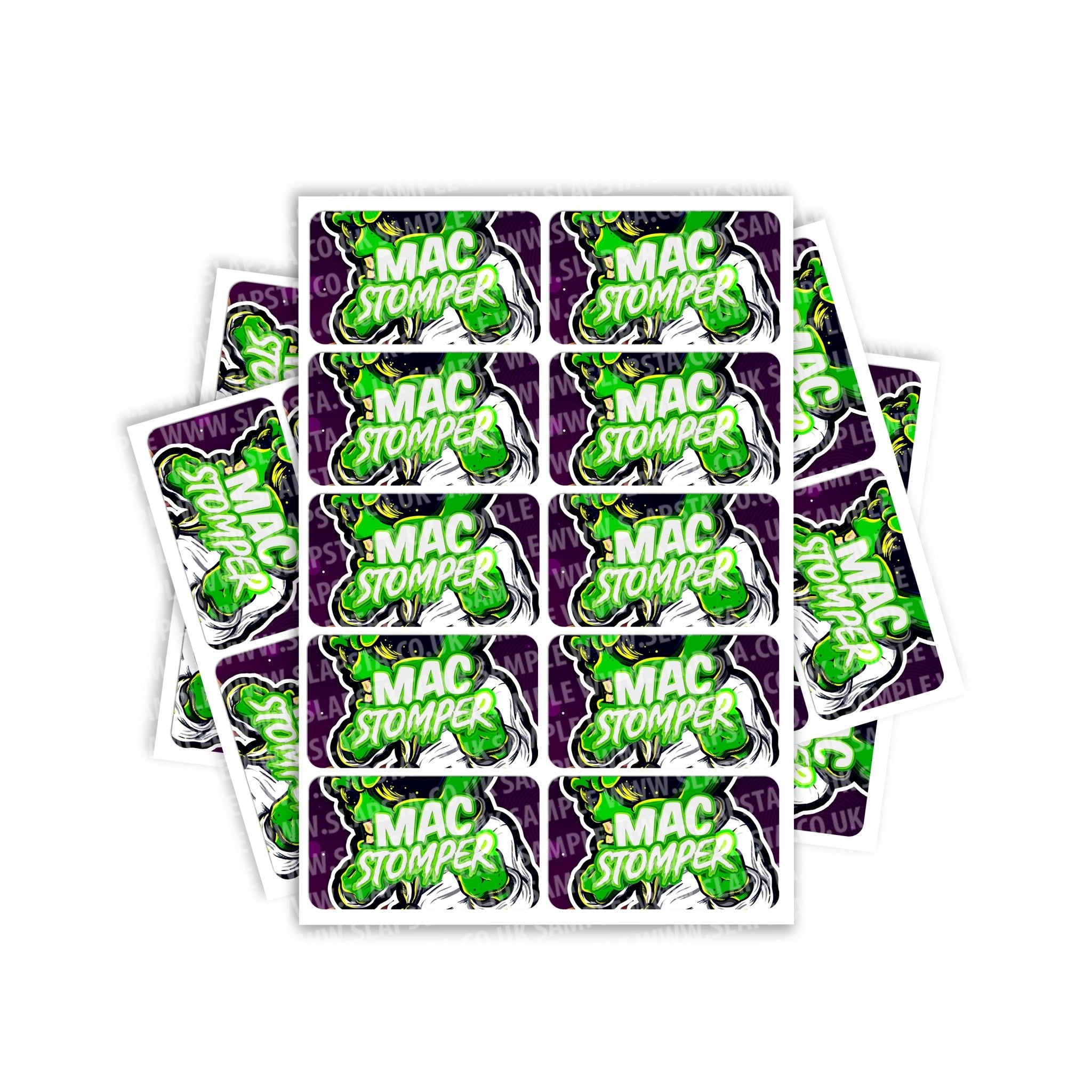 Mac Stomper gloss vinyl sticker labels. Please choose the size and quantity you require. For help sizing, please view the size guide image or use the measurements provided.
